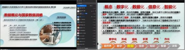 为深化数据要素与低空经济的融合互动,强化学科、人才、产业三维协同的智能发展,2026年1月6日,学院通过企业微信会议平台,成功举办以“数据概论与国家数据战略”为主题的专家座谈指导会。本次会议由工程与材料学院主办、低空经济系承办,系副主任郑丽红主持,特邀西财天府低空经济产业学院副院长苗放教授主讲,低空经济系全体教师、低空经济融合创新平台全体科研助理及毕业班学生参加本次会议。会上,苗放教授围绕会议主题,系统阐述了数据作为关键生产要素的核心价值与发展脉络,剖析了从物质文明迈向数字文明的演进历程,为师生搭建起理解数据价值的完整认知框架。