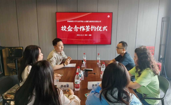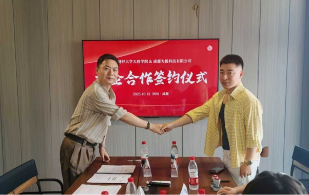 2025 年 10 月 15 日上午,西南财经大学天府学院工程与材料学院教师陈鹏冲、王健、杨越淋、蒋雨芮赴成都为极科技有限公司开展走访交流,双方成功签署人才定向培养校企合作协议,在深化产教融合、构建协同育人体系方面迈出坚实步伐,为区域产业发展与高校人才培养搭建起高效对接桥梁。